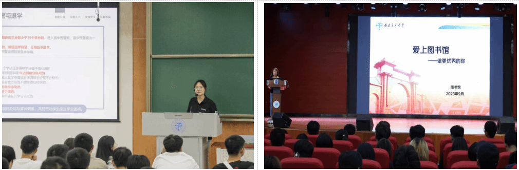 管理导航,行为引领。九月中旬,为使新生尽快适应、融入大学生活,养成良好的行为习惯,学院向全体新生开展学生管理专题教育;此外,学院邀请学校图书馆李颖老师为新生带来图书馆入馆教育专题讲座,帮助新生尽快了解和熟悉图书馆资源和服务。